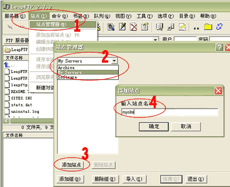 2. 運(yùn)行 LeapFTP,點(diǎn)擊1處(站點(diǎn)->站點(diǎn)管理器),彈出“站點(diǎn)管理器”窗口;在2處選擇“My Servers”項(xiàng),然后在3處點(diǎn)擊“添加站點(diǎn)”按鈕,在彈出的窗口4處輸入您喜歡的站點(diǎn)名稱(chēng)(如:mysite);
