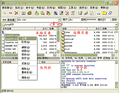 6.連接成功后的界面如下圖所示。左上框?yàn)楸镜啬夸?您可以通過(guò) 1 處的下拉菜單選擇您要上傳文件的目錄,選擇后該目錄下的所有文件都會(huì)顯示在這個(gè)框里。 選擇您要上傳的文件,并點(diǎn)鼠標(biāo)“右鏈”->“上傳”, 這時(shí)在隊(duì)列欄里會(huì)顯示正在上傳及未上傳的文件, 當(dāng)您的文件上傳成功完成后,在命令欄里會(huì)出現(xiàn)“傳送完成”的提示,此時(shí)在過(guò)程目錄欄里就可以看到您上傳的文件了。