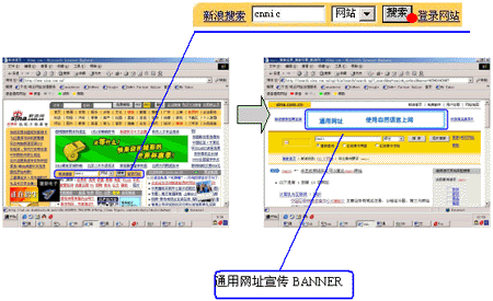 在新浪的網站搜索中輸入通用網址,點擊"搜索"按鈕,在結果頁面出現通用網址宣傳BANNER,點擊后可以進入相關網站。(確實是"綜合"搜索,而不是"網站"搜索)