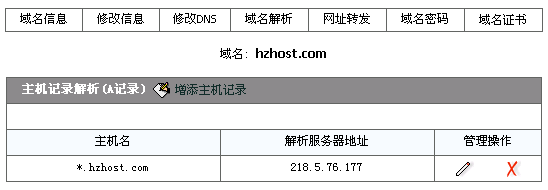 在我公司注冊(cè)的域名,或者DNS轉(zhuǎn)入到我公司的域名,我公司均免費(fèi)提供泛域名解析的功能。 現(xiàn)以域名hzhost.com為例,把泛域名*.hzhost.com解析到IP地址218.5.76.177。