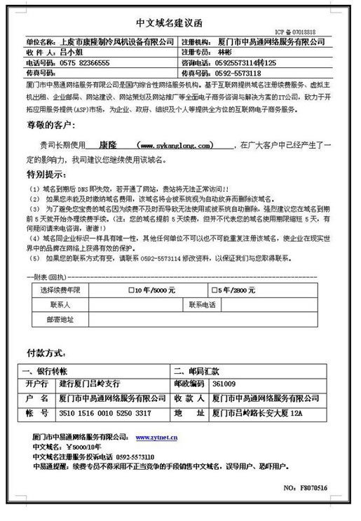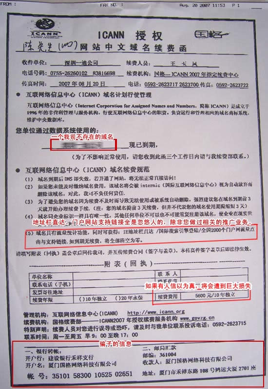 近來,我司收到客戶投訴以及同行業(yè)其他公司反饋, 發(fā)現(xiàn)最近福建省(尤其是廈門地區(qū)),有部分不法分子、不法網(wǎng)絡(luò)公司利用傳真、電話或是電子郵件的方式對(duì)我司客戶實(shí)施欺詐(其中傳真方式最多見),給我司客戶發(fā)出業(yè)務(wù)域名到期等不真實(shí)的、虛擬的續(xù)費(fèi)通知函(或通知郵件、電話、傳真等),甚至說一次性匯款3000元,域名可以終生使用,一些客戶可能會(huì)因此上當(dāng)受騙,把錢匯到這些所謂公司提供的私人賬戶上,但續(xù)費(fèi)業(yè)務(wù)(或新增業(yè)務(wù))并沒有得到任何保障。